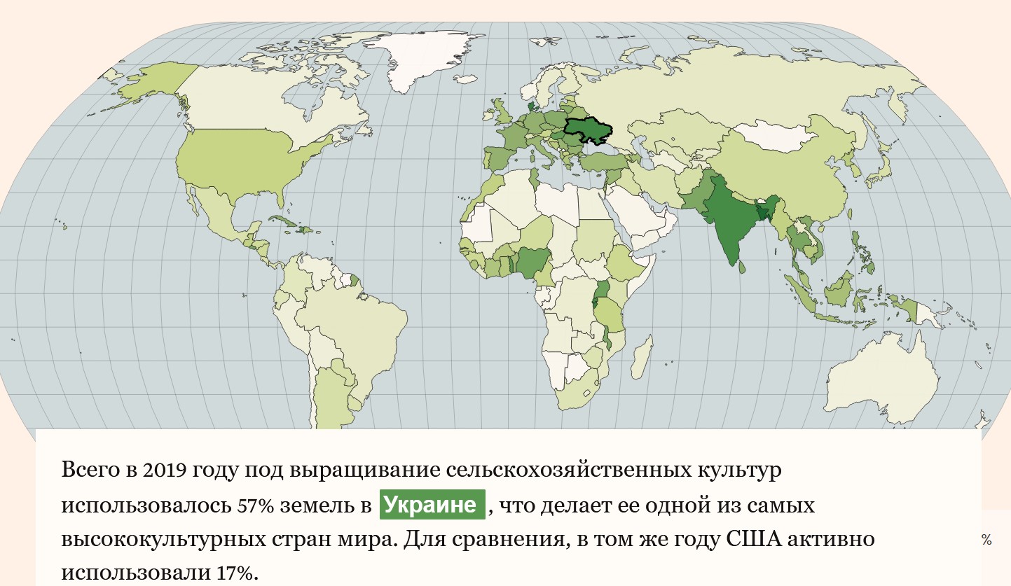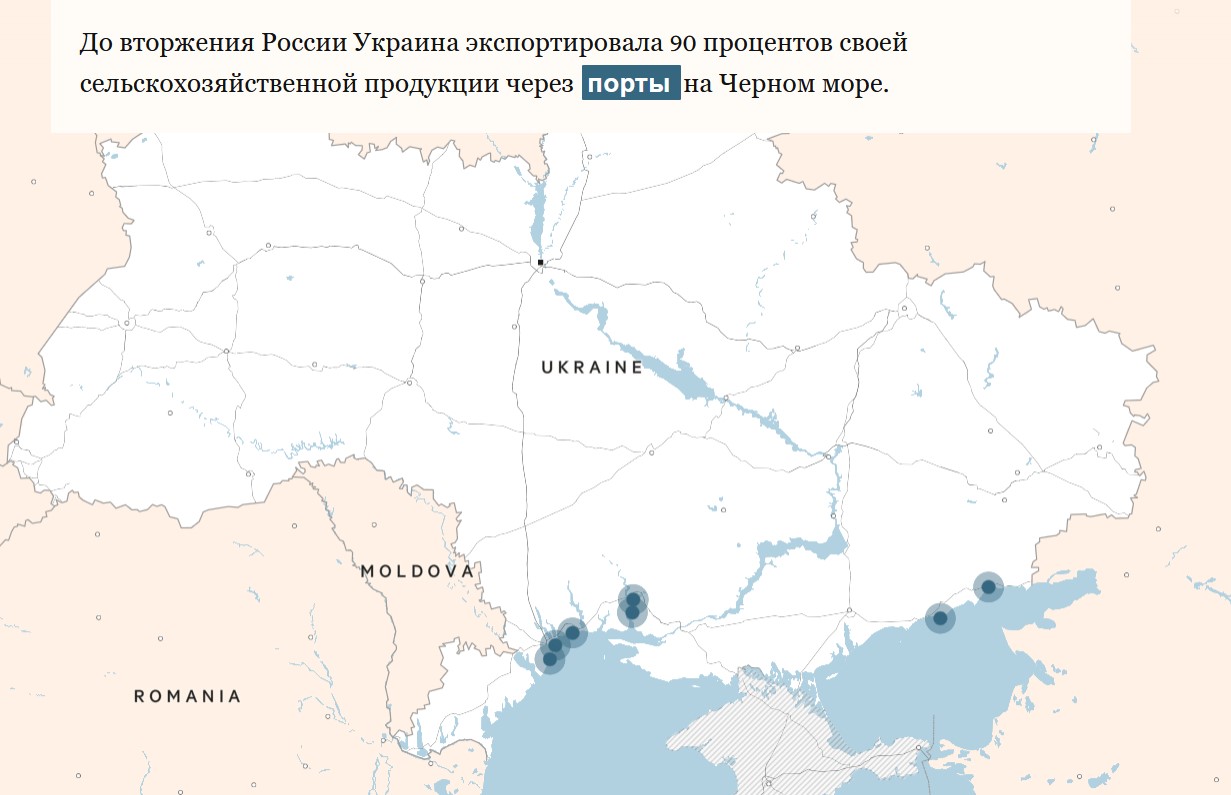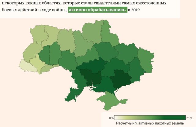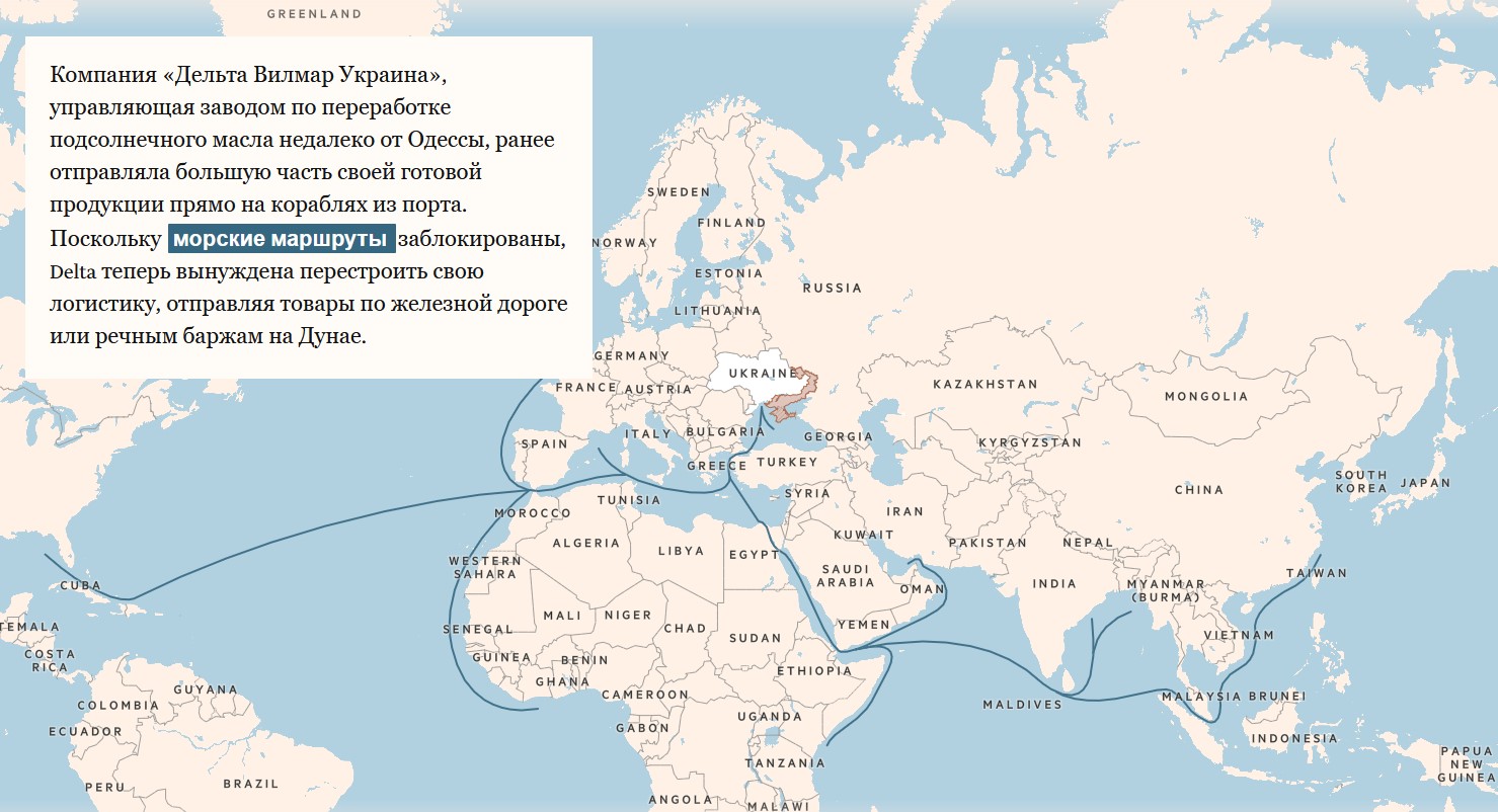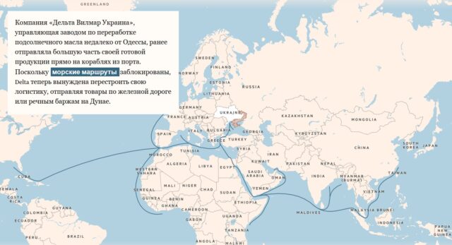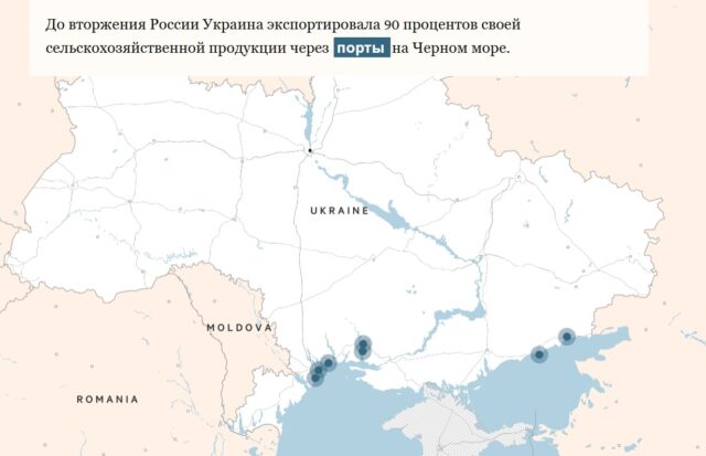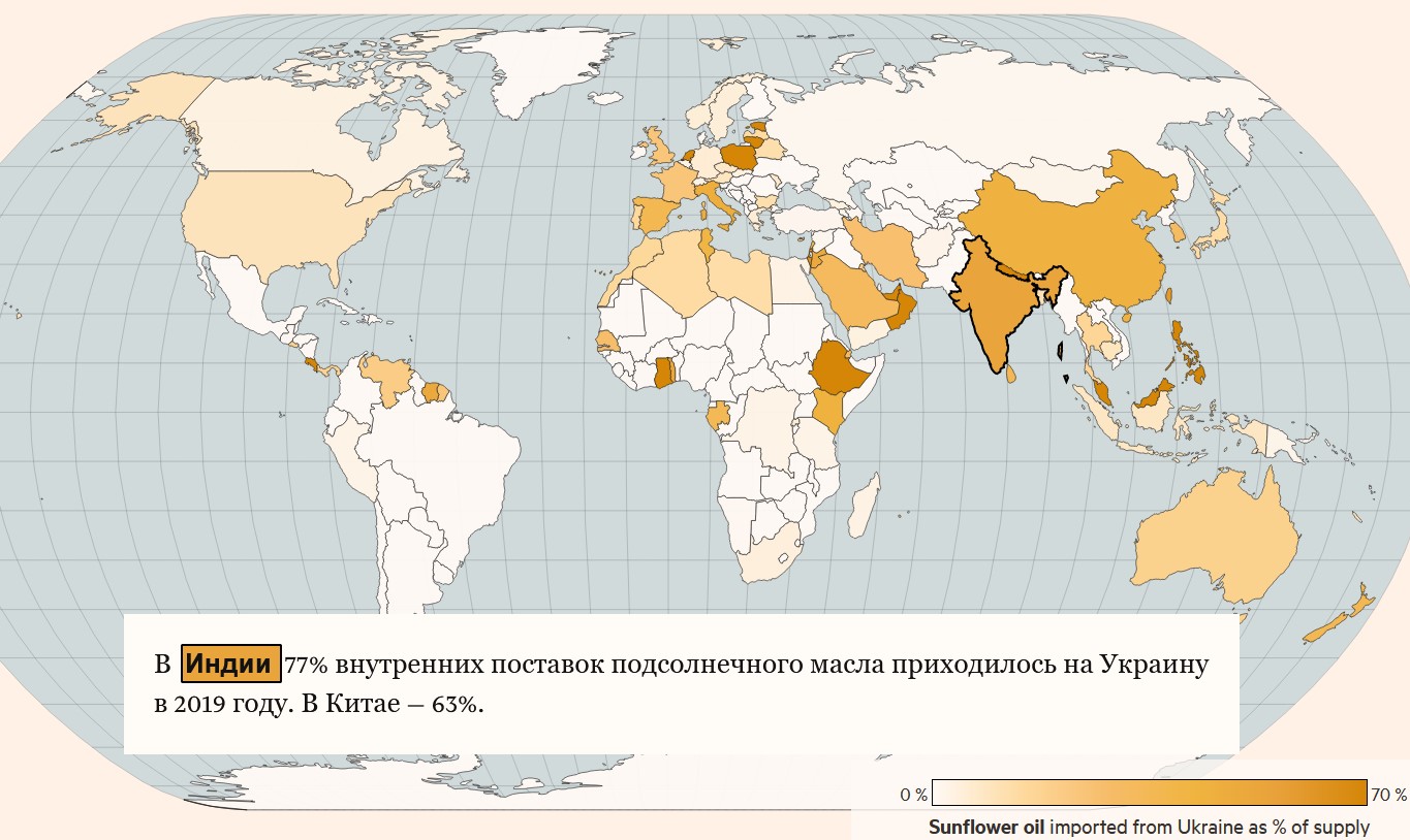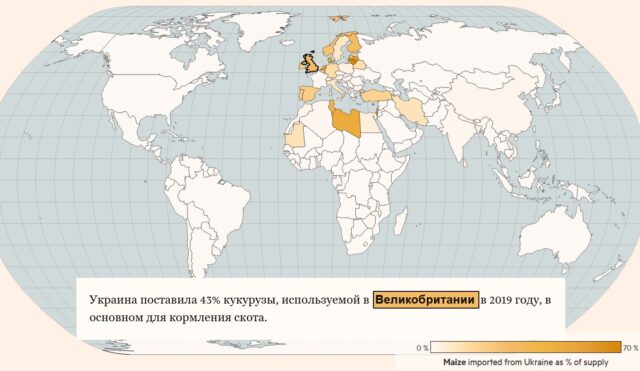 Війна зробила глобальний розрив у постачаннях. На Україну припадає 8% світового експорту пшениці, 13% постачання кукурудзи та понад третину торгівлі соняшниковою олією. Зазвичай країна експортує від 40 до 50 мільйонів тон зернових щороку, але вторгнення Росії призвело до того що обсяги експорту у березні становили чверть від лютневого, за даними міністерства сільського господарства.