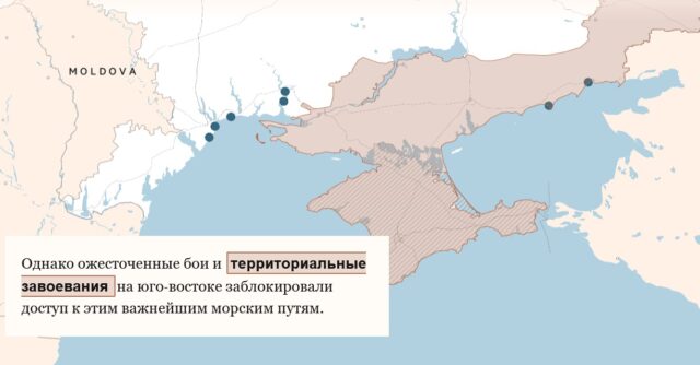 Так само, як морські блокади перешкоджають надходженню палива, вони перешкоджають вивезенню товарів. До вторгнення 90 відсотків сільськогосподарського експорту України вивозилось із країни через Чорне море. Більшість цих товарів застрягла країни і може бути експортована. Наприклад, близько 15 млн тонн, або близько 40% урожаю кукурудзи в Україні, залишається у силосах, за словами Майкла Магдовиця, аналітика сільського господарства у фінансовій компанії Rabobank.