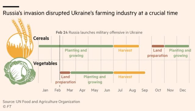 Оскільки ділянки сільськогосподарських угідь перетворились на поля битв, а дорожня та портова інфраструктура України піддається атакам російських ракет та бомб, ланцюжок поставок продовольства в країні зупинився. «Є обмеження робочого часу через комендантську годину, а також обмеження на пересування сільськогосподарської техніки через контроль на дорогах», — каже міністр агрополітики Микола Сольський.