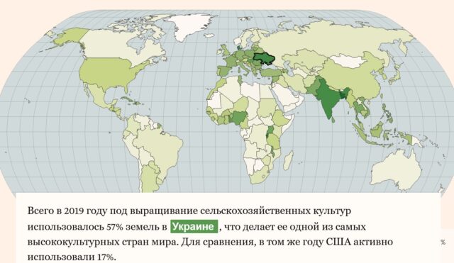 Товари вирощені в Україні складають значну частку світового сільськогосподарського виробництва. На країну припадає 30 відсотків світових запасів соняшникової олії, що широко використовується як у промисловому, так і в побутовому виробництві продуктів харчування, і вирощується 4 відсотки світової пшениці.