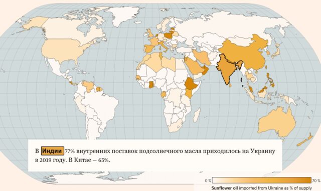 Але торкнуться будуть не лише країни, які купують безпосередньо у двох країн. Світова торгівля була побудована на очікуванні безперебійних потоків поставок, і вплив війни позначився на міжнародних ринках зерна та олії.