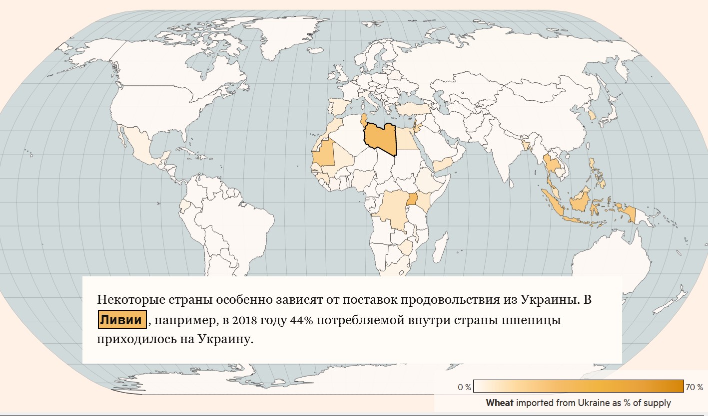 На Україну припадає 80 відсотків імпорту Лівану і є провідним постачальником для таких країн, як Сомалі, Сирія та Лівія. Росія також постачає своєму чорноморському сусіду Туреччини понад 60% пшениці, що імпортується. У березні продовольча інфляція у Туреччині підскочила до 70 відсотків.