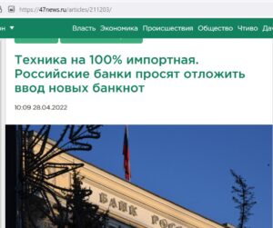 Через санкції низка закордонних постачальників банкоматів, наприклад Diebold Nixdorf і NCR, припинили надавати свої послуги на території Росії. Їх частка у російському парку банкоматів становить понад 60%. Більше 50% багатокишенькових рахунково-сортувальних машин, що використовуються в Росії, вироблено в Німеччині та Японії, постачальники яких також пішли з країни. А вся касова техніка, що використовується для обробки банкнот, є імпортною.