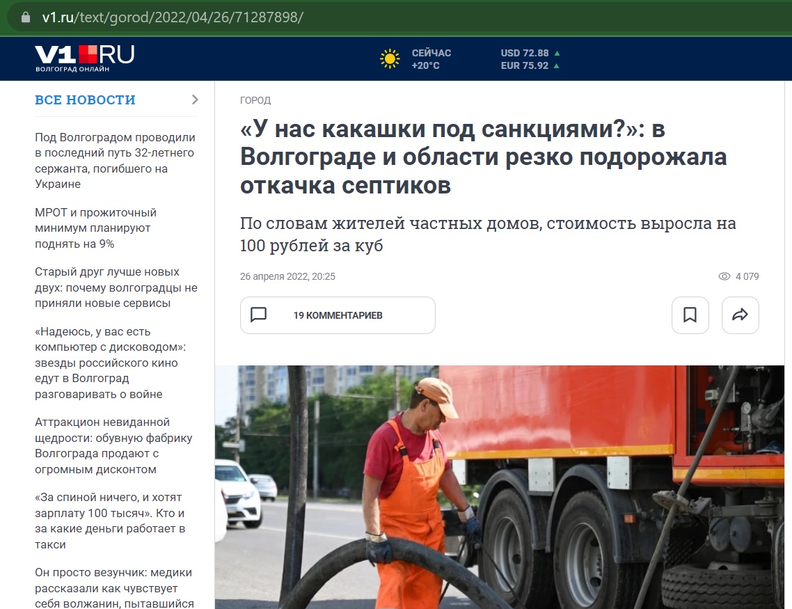 «У нас дві ями, які вирішили перед святами відкачати, у результаті замість трьох тисяч заплатили чотири, бо вартість зросла з 350 рублів до 400 (для переведення в гривні діліть приблизно на три), а якщо з минулого року дивитись, то й того більше. Було 300, стало 400, – розповіли мешканці Дзержинського району Волгограда. – Ну, куди це? У нас що і на какашки теж санкції?».