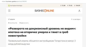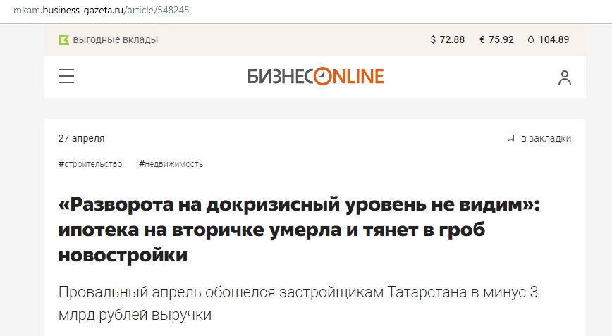 Як ідеться в статті казанського сайту «Бизнес.Online», учасники ринку нерухомості відзначають, що на початку квітня зникла дешева іпотека, спостерігається спад продажів.