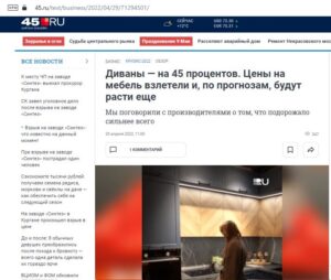 «Та практично все подорожчало. Від 50 до 100% – це клей, тканини імпортні подорожчали, пінополіуретан подорожчав, метал подорожчав, ДСП – все подорожчало, – розповіла Балашова. Ми наразі намагалися у відділі постачання з’ясувати, що все ж таки не подорожчало. Вони не змогли нічого пригадати і не навели жодного прикладу з того, що лишилось на колишньому рівні».