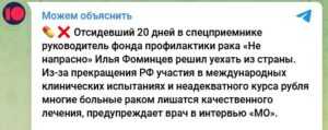 Через припинення РФ участі в міжнародних клінічних випробуваннях та неадекватного курсу рубля багато пацієнтів з онкозахворюваннями можуть втратити якісне лікування, повідомляє ТГ-канал «Можемо пояснити» з посиланням на керівника фонду профілактики раку «Не даремно» Іллю Фомінцева.