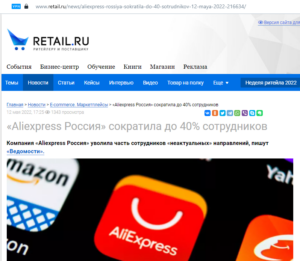 «AliExpress Росія» почала скорочувати співробітників неактуальних відділів. Звільнення зачепили приблизно 40% персоналу компанії. Скорочення розпочалися ще місяць тому. Першими під них потрапили співробітники тих напрямків, які стали неактуальними після «зміни геополітичної обстановки», тобто внаслідок санкцій проти Росії за її вторгнення в Україну. Мова передусім про відділи експорту та імпорту товарів (власних закупівель).