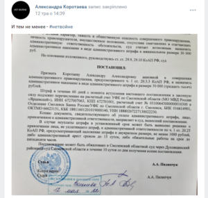 Духівщинський районний суд Смоленської області Росії 12 травня засудив вчительку Олександру Коротаєву із села Шестаково до штрафу в 30 тис рублів (для переведення у гривні діліть приблизно на три) за статтею 20.3.3 («дискредитація збройних сил РФ»).