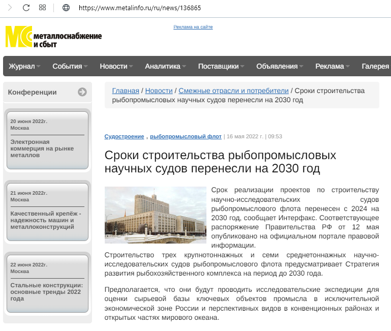 Уряд Росії 12 травня розпорядився перенести термін реалізації проектів із будівництва науково-дослідних судів рибопромислового флоту на шість років – з 2024 на 2030 рік.