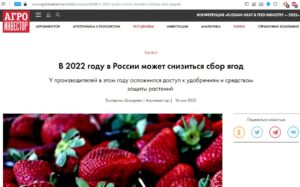 Гендиректор Ягідної спілки Ірина Козій розповіла виданню, що у 2022 році збір ягід у Росії буде нижчим від рівня минулих років. За попередньою оцінкою, показник досягне приблизно 16-18 тис т. Для порівняння, у 2020 році було зібрано 18,6 тис т, у 2019 році – 18,7 тис т. Даних за 2021 рік немає, оскільки Росстат ще не публікував дані щодо врожаю плодових культур. Збір ягід зменшиться, бо цьогоріч у виробників ускладнився доступ до добрив та засобів захисту рослин. Мова про санкції проти Росії за вторгнення в Україну.