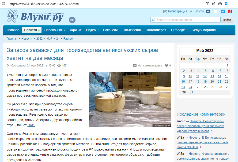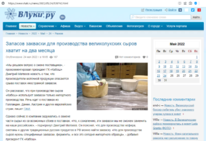 Імпортна закваска для виробництва сирів у Великих Луках Псковської області скінчиться через два місяці. Про це пише «ВЛуки.Ру» за даними «Псковського агентства інформації».