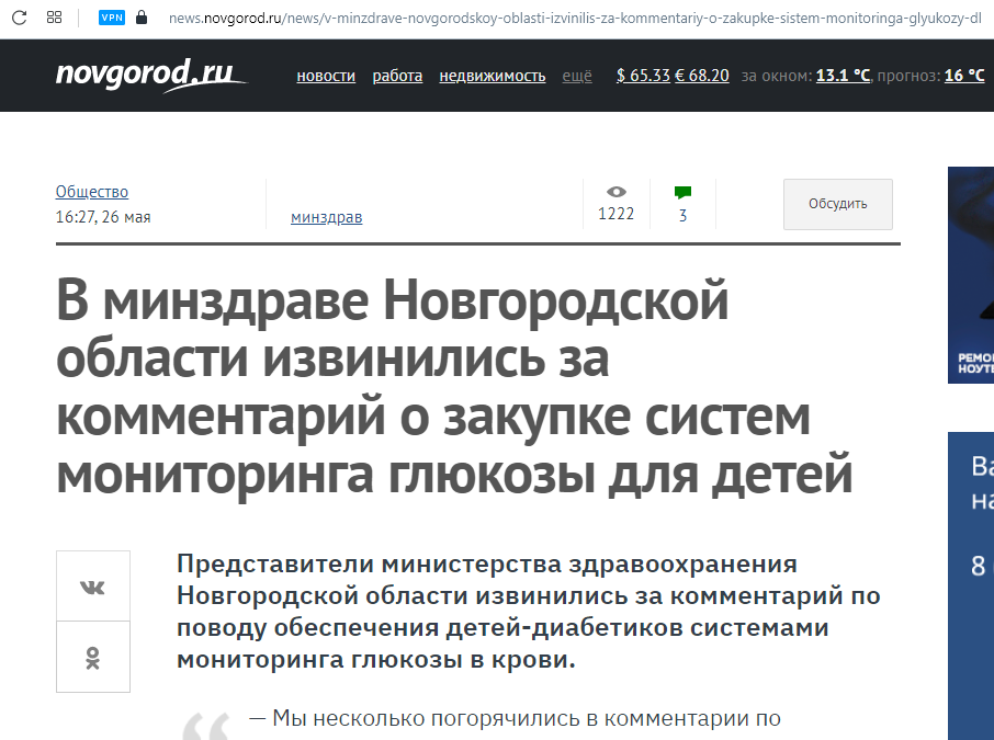 Приводом для публікації «Новгород.ру» стало не так звернення батьків дітей-діабетиків, як відповідь обласного міністерства охорони здоров’я. У ній говорилося, що всіх дітей вже забезпечили тест-полосками, а купівля систем моніторингу глюкози «спричинить додаткові витрати регіонального бюджету. Тому надалі це позначиться на інших статтях, куди регіон планував ці гроші витратити, наприклад, благоустрій територій».
