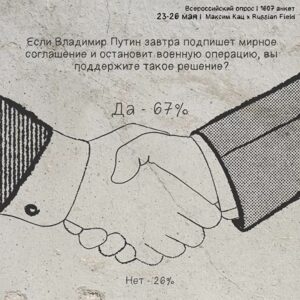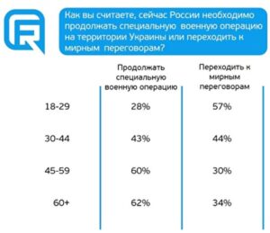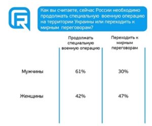 Показовим є порівняння питань про перехід до мирного вирішення конфлікту: за перехід до мирних переговорів виступили близько 40% опитаних, проте якби вже завтра мирну угоду підписав президент Володимир Путін, його підтримали б 67% респондентів.