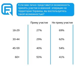 Більшість опитаних чоловіків не брали б участі у військовій операції на території України. Частка бажаючих взяти участь у військових діях збільшується з віком, проте сягає 50% лише серед пенсіонерів. Та за місяць фактично не змінилось співвідношення хто хотів би та не хотів би взяти участь у війні.