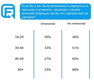 Підтримка військових дій зростає від молодшого віку до старших. Молоді респонденти налаштовані критичніше за інших: половина з них хотіла б скасувати рішення про початок військової операції, вони ж частіше висловлюють несхвалення у відповідь на пряме запитання.