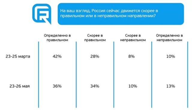 Частка респондентів, упевнених у тому, що Росія рухається у правильному напрямку, скоротилася – опитані стали частіше обирати м’якіший варіант оцінки. Також зріс відсоток тих, хто вважає, що країна вибрала неправильний шлях.