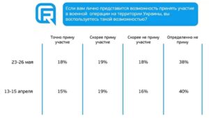 Відповіді респондентів не змінилися або змінилися незначно (в рамках похибки) з ключових питань: оцінки успішності військової операції, бажання особисто взяти участь у військових діях та при відповіді на пряме питання про підтримку військової операції (співвідношення противників та прихильників залишилося на рівні березня).