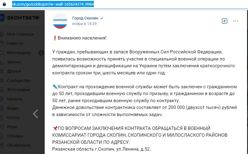 2 червня у групі Місто Скопін (Рязанська обл. РФ) ВКонтакте з’явилося оголошення від місцевого військкомату, який пропонує брати участь у військових діях в Україні та пропонує укласти короткостроковий контракт терміном 3, 6 місяців або 1 рік. Про це пише «Нова газета-Рязань».