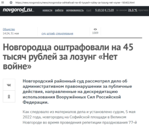 Новгородця оштрафували за те, що він викрикнув «Слава Україні» та «Ні війні» перед лавами силовиків на репетиції святкування 9 травня. Про це повідомляє «Новгород.ру».