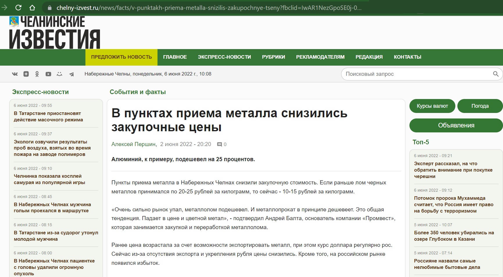 Пункти прийому металу у Набережних Човнах (Татарстан, РФ) знизили закупівельні ціни. Якщо раніше брухт чорних металів приймався по 20-25 рублів за кілограм, то зараз – 10-15 рублів за кілограм (щоб перевести у гривні, діліть приблизно на 3).