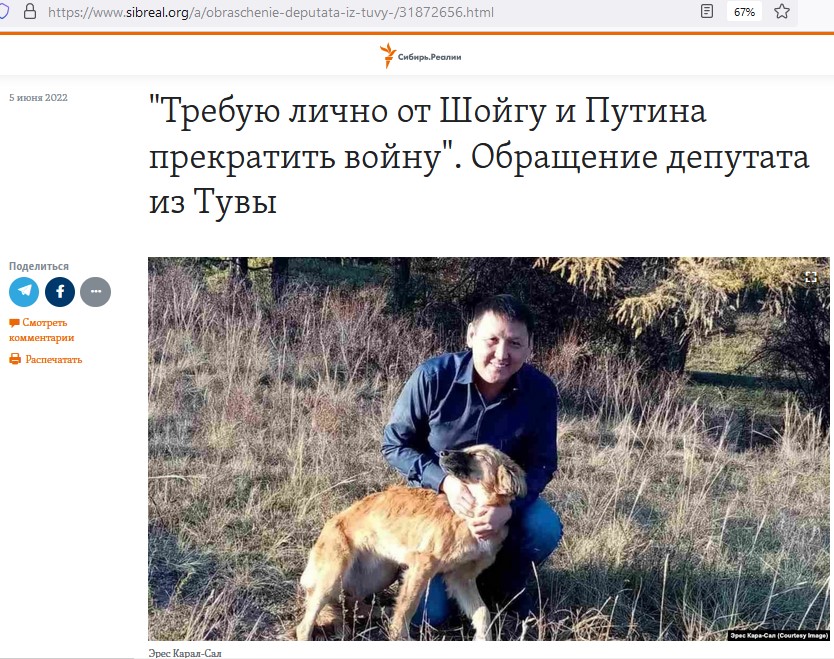 Депутат тувинського Верховного Хуралу Ерес Кара-Сал записав відеозвернення та опублікував пост, де він виступив проти проведення так званої «спеціальної військової операції» Росії в Україні, тобто війни. На думку Кара-Сала, навіть у разі військової перемоги Росії на країну чекає ізоляція від усього світу і неминуча деградація, повідомляє «Сибір.Реалії».