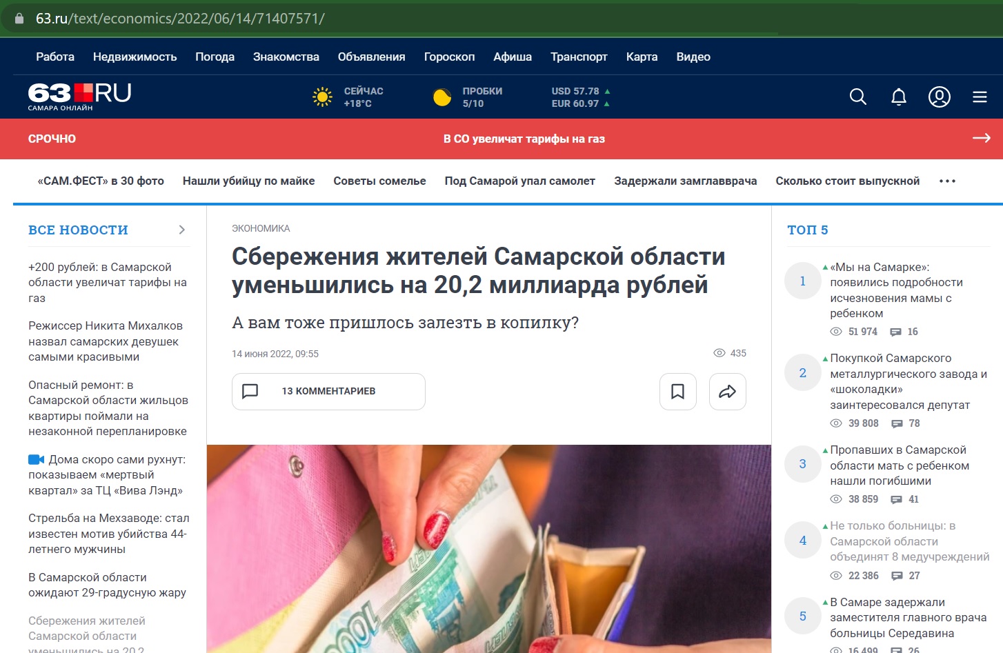 Крім того, судячи з офіційної статистики, видатки населення Самарської області за перший квартал 2022 року склали майже 306 мільярда рублів. Це при тому, що обсяг доходів мешканців становить 286 мільярда рублів. Мабуть, саме тому людям довелося залізти у свої заощадження.
