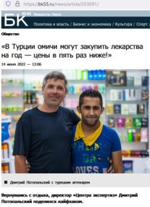 Омське онлайн-видання bk55.ru розмістило на своєму сайті матеріал, у якому російський турист, що повернувся з відпочинку в Туреччині, ділиться досвідом закупівлі ліків, які значно дешевше від російських: більшість препаратів у 5 і більше разів дешевші.