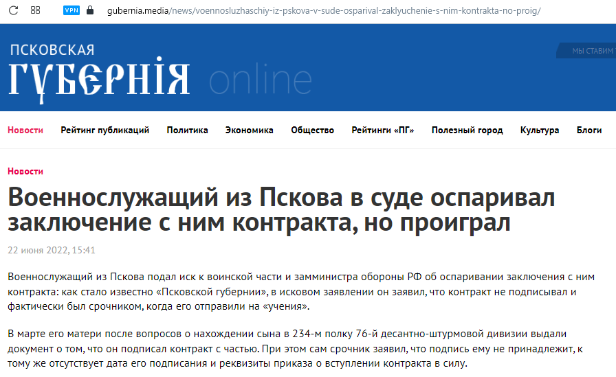 Як дізналось видання, у позовній заяві військовослужбовець заявив, що контракт він не підписував і фактично був строковиком, коли його відправили на «навчання». У березні його матері після запитань про перебування сина у 234-му десантно-штурмовому полку 76-ї десантно-штурмової дивізії видали документ про те, що він підписав контракт із частиною. При цьому сам строковик заявив, що підпис йому не належить, до того ж відсутня дата його підписання та реквізити наказу про набуття чинності контракту.