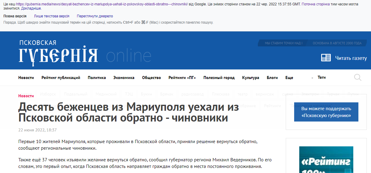 Перші десять українців із Маріуполя, які проживали у Псковській області, вирішили повернутися назад. Ще 37 людей виявили бажання повернутися назад. Про це повідомили регіональні чиновники, а також губернатор регіону Михайло Ведерніков. За його словами, Псковщина уперше направляє громадян назад до місць їхнього постійного проживання.