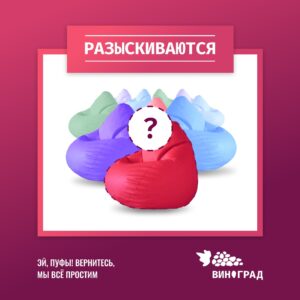 «Терміново розшукуються. М’які, зручні, барвисті пуфи! З початку ярмарку «Виноград» територію Фінського парку залишив 51 пуф. Друзі, ми дуже сподіваємося, що ви взяли їх не зовсім і повернете в цілості та безпеці на територію ярмарку. Повернути пуф – це чудова можливість заглянути до нас знову і взяти участь у дегустаціях та майстер-класах. Ми чекаємо вас! І пуфи».