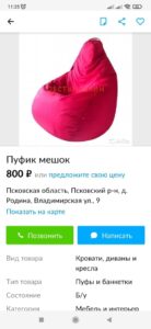 Коментатори «ВКонтакті» вже виклали фотографії якихось підлітків із такими пуфами в руках і знайшли оголошення на майданчику «Авіто» про продаж таких самих пуфів у селі Родіна в Псковському районі по 800 рублів (для переведення у гривні діліть десь на три).
