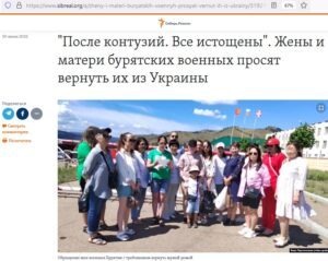 У Бурятії дружини, матері та сестри військових записали відеозвернення до глави республіки Олексія Циденова з проханням повернути їхніх чоловіків з України додому. Учасниці звернення розповіли, що солдатів ще в січні було відправлено на «навчання» до Білорусі, з кінця лютого вони перебувають в Україні – частина з них серйозно контужена, і абсолютно всі серйозно виснажені через погане забезпечення, повідомляє «Сибір. Реалії».