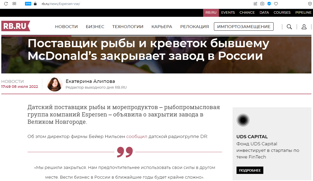 Група «Espersen» вирішила тимчасово призупинити роботу комбінату ще в березні, коли загалом 91 російського працівника відправили додому з виплатою заробітної плати. Тепер компанія остаточно залишає ринок. Для Росії це означає, що припиняться постачання риби до ресторанів колишньої мережі «McDonald’s». Адже продукція саме цієї компанії використовувалася у приготуванні рибних бургерів та креветкових ролів. Отже, тепер під загрозою у новій мережі «Смачно – і крапка» опиняється не лише картопля, а й риба.
