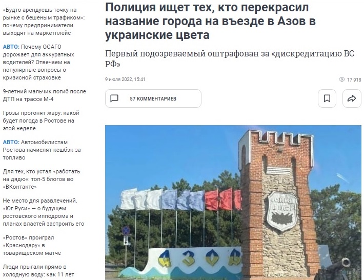 В місті Азов Ростовської області поліція почала шукати тих, хто пофарбував літери на постаменті з назвою міста в синьо-жовті кольори, тобто кольори українського прапора. При це пише «161.ru».