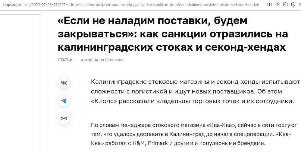 За словами менеджера стокового магазину «Ква-Ква», зараз у мережі торгують тим, що вдалося доставити до Калінінграда до початку «спецоперації». «Ква-Ква» працював з H&M, Primark та іншими популярними брендами.
