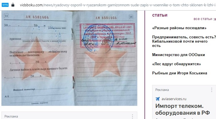 На опублікованій фотографії у військовому квитку поставлено штамп із написом «Схильний до зради, брехні та обману. Відмовився від участі у спеціальній військовій операції на території ЛНР, ДНР та України у 2022 році».