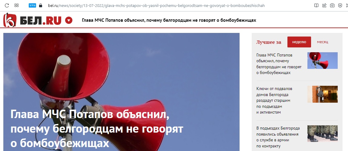Начальник ГУ МНС РФ по Бєлгородській області Сергій Потапов на зустрічі з журналістами заявив, що місцезнаходження бомбосховищ є секретною інформацією.