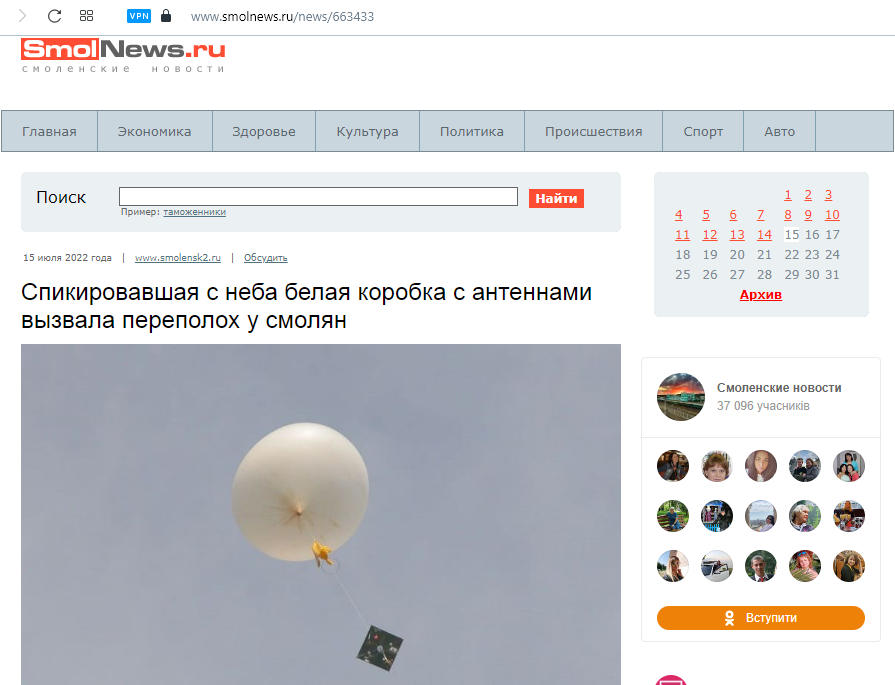 Невідомий апарат, схожий на роутер, на парашуті приземлився на капот автомобіля, припаркованого біля онкодиспансера у Смоленську. Як розповіла читачка, коробка була розміром з аркуш А4. На місце викликали спецслужби. З’ясувалося, що це метеозонд, за допомогою якого роблять прогнози погоди. Такі апарати фахівці запускають у небо на великих кулях, що піднімаються на висоту 30 км. Потім куля лопається від надлишкового тиску, а сама капсула зонда спускається назад на землю. Його, як правило, відносить на пристойну відстань, тому одноразовий «витратник» не підбирають і не використовують повторно. Але 14 липня зонд приземлився на автомобіль на очах у збентежених смолян.