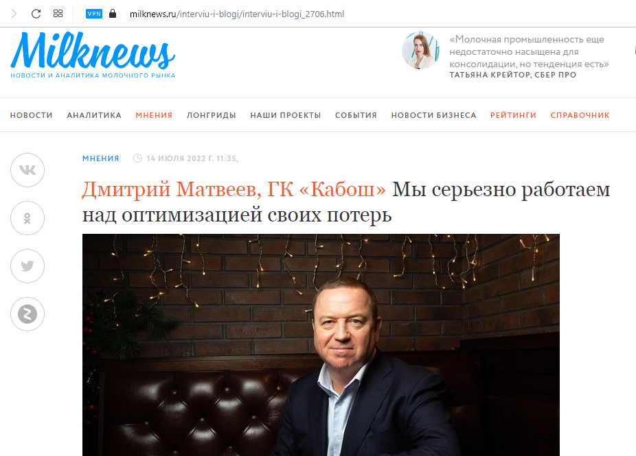 Голова групи компаній «Кабош» із Великих Луків Псковської області Дмитро Матвєєв розповів порталу «Milknews» про ситуацію на підприємстві через санкції проти Росії за напад на Україну. Воно живе на запасах імпортних запчастин, не знаючи, що буде далі.