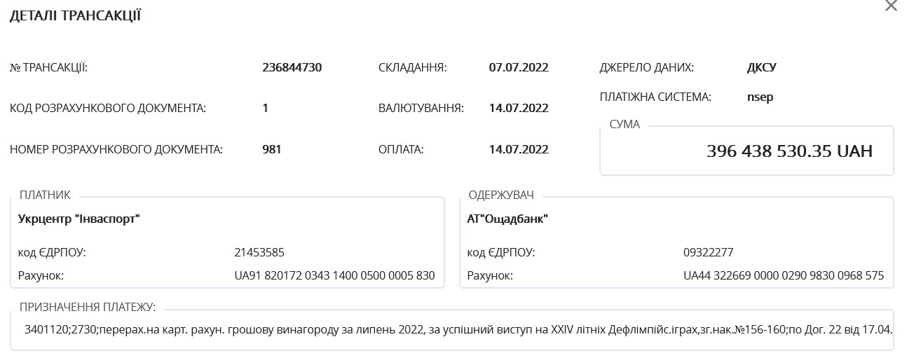 14 липня  Укрцентр «Інваспорт» перерахував на «Ощадбанк» 396 млн грн (більше $10 млн) за успiшний виступ на XXIV літніх Дефлімпійських іграх серед спортсменів з порушеннями слуху. Про це повідомляється в системі «Spending».