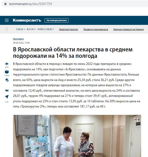 В січні-червні 2022 року у Ярославській області медичні препарати подорожчали в середньому на 14%.