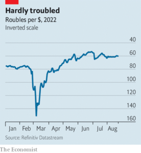 Однак знадобилося лише кілька тижнів для відновлення курсу рубля, що 25 липня дозволило ЦБ РФ швидко знизити ставки до 8%. Офіційний обмінний курс не відображає справжнього апетиту до валюти: контроль за рухом капіталу, вперше введений після заморожування рубля, в основному залишається чинним. Але це все одно вказує на ваду в первісному плані Заходу. У той час як закордонні запаси доларів і євро в КБР залишаються під забороною, Росія щодня заробляє свіжу тверду валюту завдяки своєму гігантському експорту нафти та газу. Це означає, що їй не потрібно брати кредити, що робить її дефолт значною мірою несуттєвим.