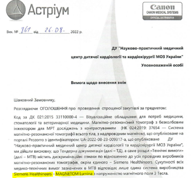 «Науково-практичний медичний центр дитячої кардіології та кардіохірургії МОЗ України» провів тендер на придбання магнітно-резонансного томографу за 110 млн грн з дискримінаційними вимогами. Вони були заточені під те, аби в тендері міг взяти участь лише той учасник, який пропонував єдиний апарат визначеної марки та конфігурації. Один з конкурентів офіційно скаржився на це перед торгами, але його вимоги замовник проігнорував та купив по визначений ціні саме той апарат, під який були заточені торги. Про це повідомляється у системі «Прозорро».