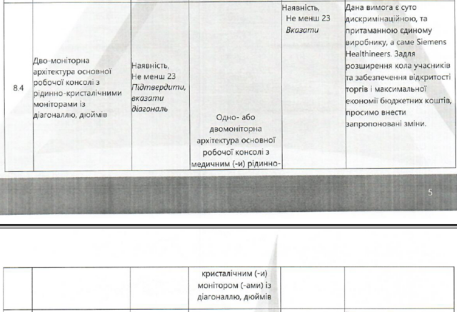 Наприклад, кардіоцентр вимагав двомоніторну архітектуру основної робочої консолі з рідкокристалічними моніторами діагоналлю не менше 23″. Фірма заявила, що ця вимога суто дискримінаційна і притаманна єдиному виробнику «Siemens Healthineers». Тому вона пропонувала замінити формулювання на одно- або двомоніторну архітектуру основної робочої консолі з медичними рідкокристалічними моніторами діагоналлю не менше 23″.