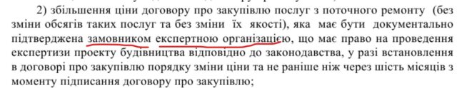 Суть законопроекту полягає у наступному: дозволити державним замовникам змінювати істотні умови договорів про закупівлю робіт та послуг з поточного ремонту через шість місяців після укладення самої угоди. А саме дозволити підвищувати ціну будівельних договорів, якщо це підвищення документально підтвердить експертна організація, що має право на проведення експертизи проекту будівництва відповідно до законодавства.