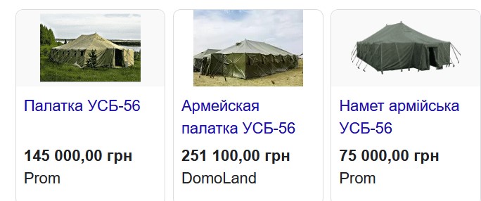 Міноборони замовляло «Сівертексу» модернізовані намети УСБ-56/2021 за ТУ У 25.1-00310143-086:2005 зі змінами №5 вперше у листопаді 2021 року. Тоді зовнішні намети з тканини С коштували 45 тис грн, а внутрішні намети – 29 700 грн. Разом це становило 74 700 грн, або $2 828. У доларах це на 21% дешевше від нинішньої ціни для залізниці.