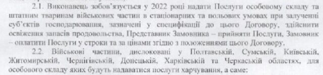 Контракт з «Ок ленд фудом» передбачав поставку харчів не тільки для військових у далеких від лінії фронту Полтавській, Сумській, Київській, Житомирській, Чернігівській і Черкаських областях. Але і для військових частин Харківської і Донецької областей. Тобто саме у фронтових областях, куди доставка продуктів очевидно має коштувати дорожче, ніж у регіонах без активних бойових дій.