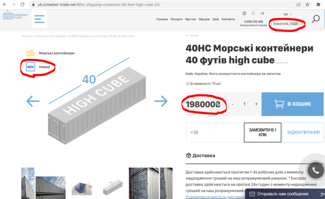 Вживані сорокафутові контейнери high cube там пропонуються ще дешевше: 1 категорії – по 142 тис грн, 2 категорії – по 122–132 тис грн із ПДВ. Що значать категорії, не сказано. Доставка із Тернополя, де вони знаходяться, на Полтавщину обійшлась би у 16 170 грн. Разом ціни становили б 158 тис грн і 138-148 тис грн. Це в середньому вдвічі дешевше.