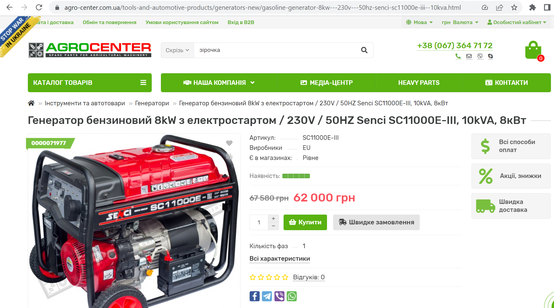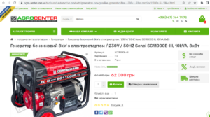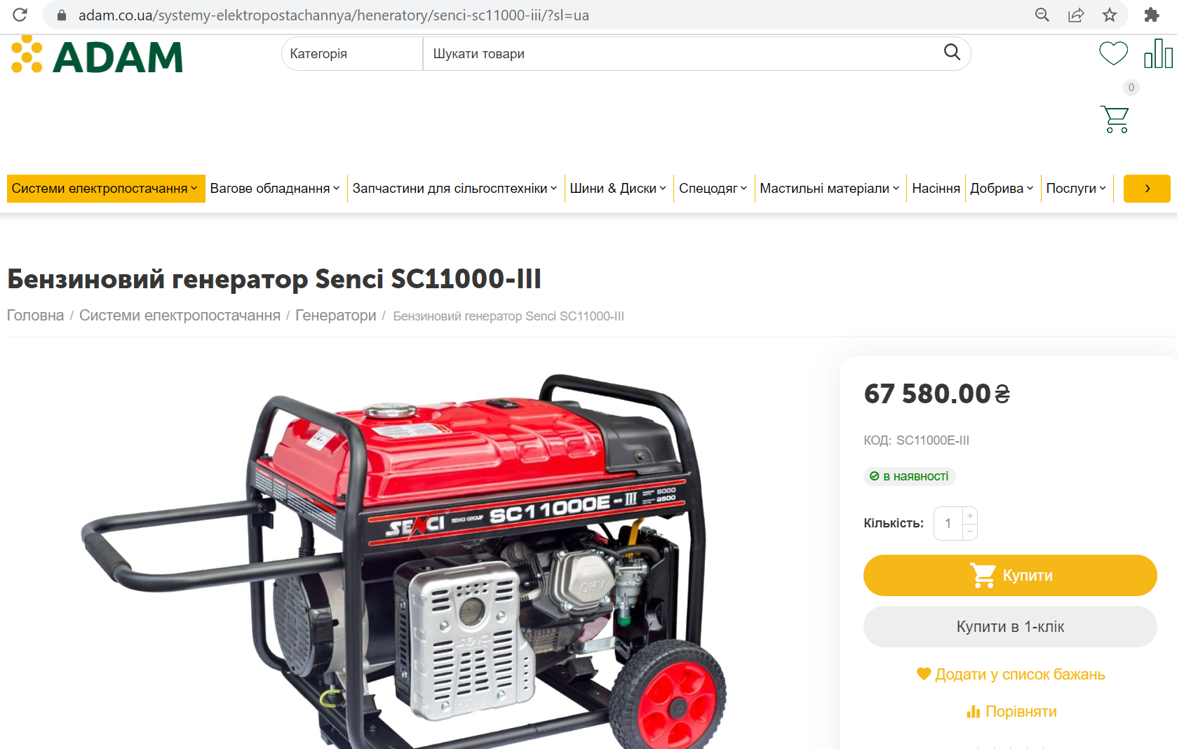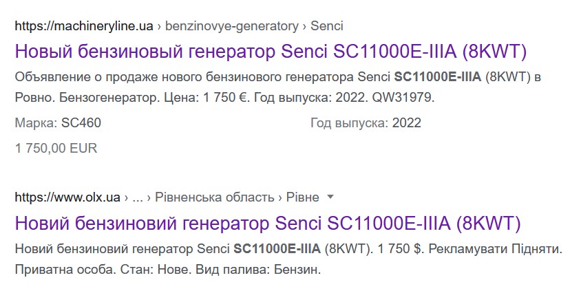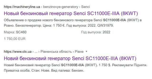 Найбільша сума 14 млн грн іде на 137 мобільних бензинових генераторів Senci SC11000E-IIIA номінальною повною потужністю 11 кВА по 105 тис грн. Саме цієї моделі з літерою A немає у продажу. Раніше їх продавали у Рівному по 1 750 євро, що складає 64-68 тис грн. Тобто в півтора раза дешевше від договірної ціни. Ці оголошення на майданчиках «Machineryline» і «OLX» вже недоступні, але збереглися у видачі Гуглу.